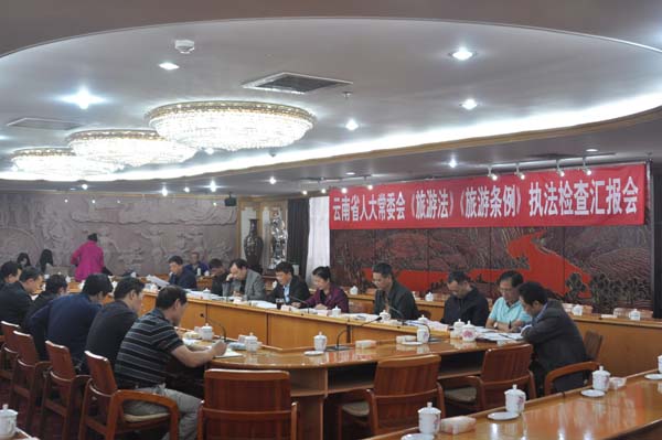 执法检查组组长、省人大常委会副主任刀林荫反馈执法检查情况。她说,全省各级政府及时宣传学习贯彻“一法一条例”,旅游法制意识有所增强;旅游管理体制机制正积极建立健全;更加注重旅游资源保护和可持续利用;加快旅游公共服务体系的建设步伐;旅游产品日益丰富,为推进旅游强省战略做了大量有效的工作。同时对进一步抓好旅游“一法一条例”宣传贯彻提出工作建议和要求。在执法检查中也有不尽人意的地方,学习宣传“一法一条例”有待加强,旅游综合协调体制机制有效运行不到位,旅行社经营不规范,旅游执法队伍建设滞后,旅游专业人才结构不够合理等。为此她强调,要进一步加大旅游“一法一条例”普法宣传力度,加强旅游市场管理,理顺旅行社与导游之间的关系,提高旅游公共服务水平,进一步提高旅游人才队伍素质,努力开创云南旅游新局面。