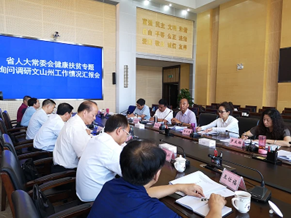 10日至11日,调研组分别在广南县、文山州召开座谈会,听取了广南县、文山州人民政府开展健康扶贫工作情况汇报。相关部门以及部分省、市、区人大代表,建档立卡户代表参会。调研组认为文山州健康扶贫工作在州委、州人民政府强有力的领导下,取得了一定的成绩,制定的文山州健康扶贫实施方案,结合实际,有特色,有亮点。但还要进一步加大健康扶贫政策的宣传力度;加快28种慢、特病门诊就诊服务证的办理工作;完善县乡村三级建档立卡贫困户健康扶贫台账;在基本公共卫生服务项目和补助标准上实现信息公开透明。采取更有力的措施,抓实抓细健康扶贫各项工作。