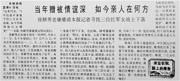 这段鱼水情深的故事经采写刊发后,感动了许多人。邓颖超、蔡畅、康克清等15位当年的女红军发表谈话:“悠悠五十载,沧海变桑田,我们也想念那些大爷、大娘、大哥、大嫂们。”在邓颖超主持下,一场寻找3位红军姑娘的行动在全国展开。遗憾的是,那3位女红军一直没有音讯。