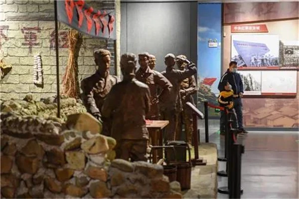家长带着孩子参观位于湖南省郴州市汝城县文明瑶族乡沙洲瑶族村的“半条被子的温暖”专题陈列馆