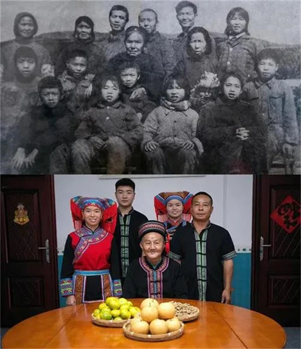 徐解秀一家上世纪八十年代的全家福和徐解秀的儿子朱中雄一家于2020年拍摄的全家福