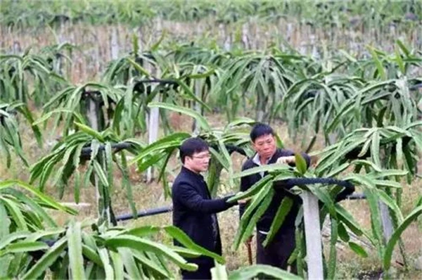 在广西百色市田东县思林镇真良村,80后青年党员梁青松(左)和60后的“脱贫户”梁日础在火龙果基地查看火龙果的长势