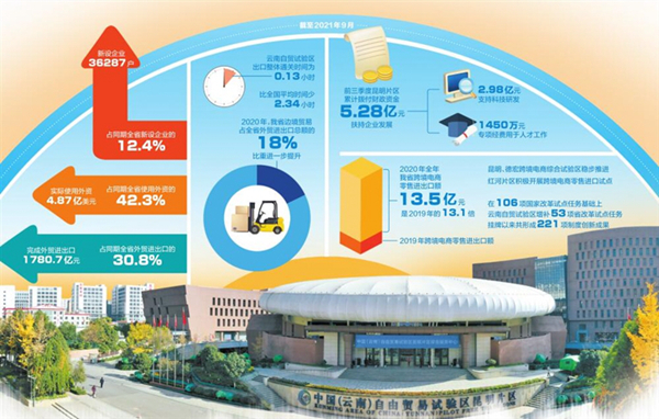 中国(云南)自由贸易试验区自2019年8月30日挂牌成立以来,突出沿边跨境、云南首创的特点进行探索尝试,在开放发展中书写新答卷。截至2021年9月,仅占全省国土面积0.03%的云南自贸试验区新设企业36287户,占同期全省新设企业的12.4%;完成外贸进出口1780.7亿元,占同期全省外贸进出口的30.8%;实际使用外资4.87亿美元,占同期全省使用外资的42.3%。
