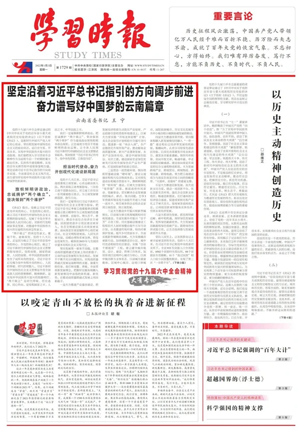 1月3日,《学习时报》头版头条刊发云南省委书记王宁署名文章。
