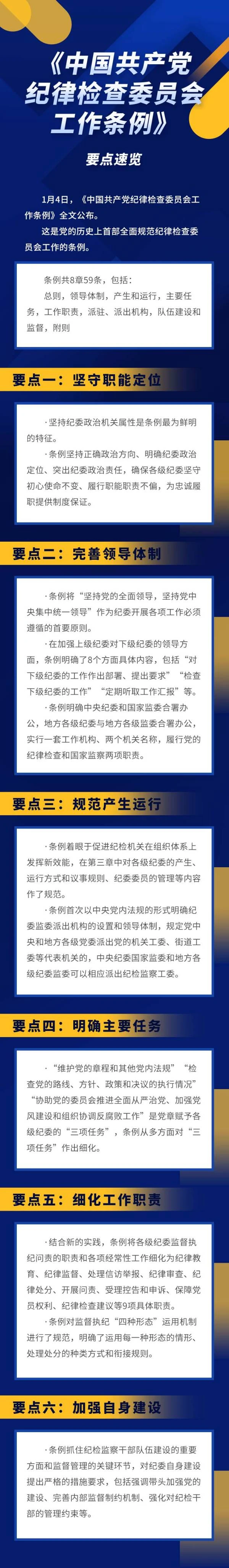 1月4日,《中国共产党纪律检查委员会工作条例》(以下简称条例)全文公布,这是党的历史上首部全面规范纪律检查委员会工作的条例。
