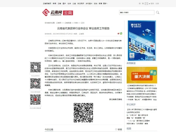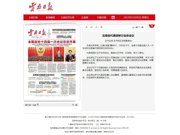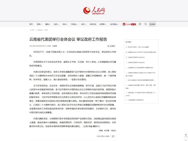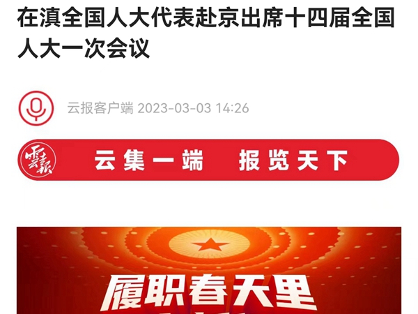 人民网、云南日报、云南广播电视台、云报客户端、云南网等媒体关注云南省代表团参会情况,对代表团抵达北京、参加代表团全体会议、代表小组会议、提交议案建议等工作进行报道。
