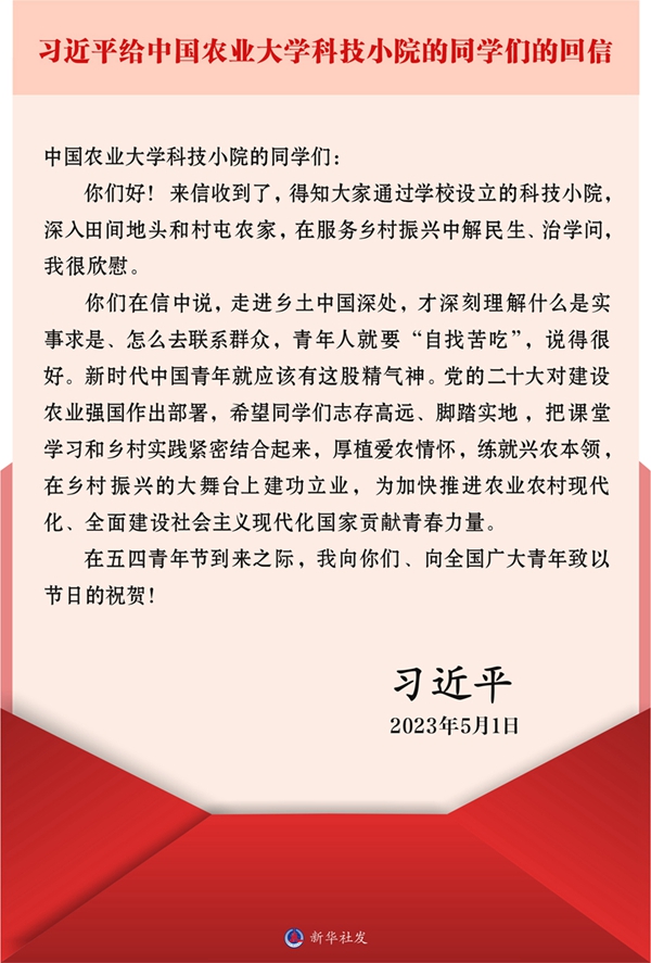 中共中央总书记、国家主席、中央军委主席习近平近日给中国农业大学科技小院的同学们回信,提出殷切期望,并在五四青年节到来之际,向全国广大青年致以节日的祝贺。