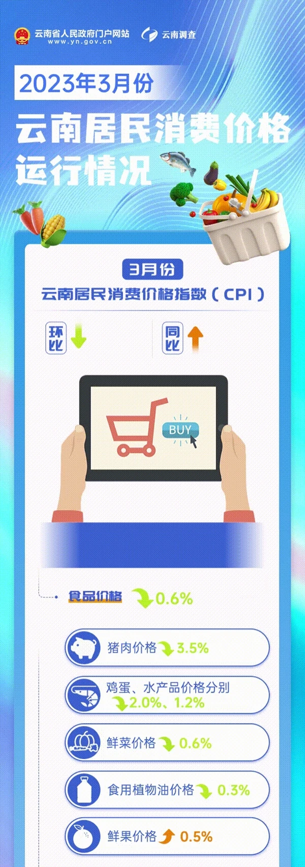 国家统计局云南调查总队根据国家现行统计调查制度规定依法开展的居民消费价格调查结果显示:2023年3月份,云南居民消费价格指数(CPI)环比下降0.2%、同比上涨0.9%。
