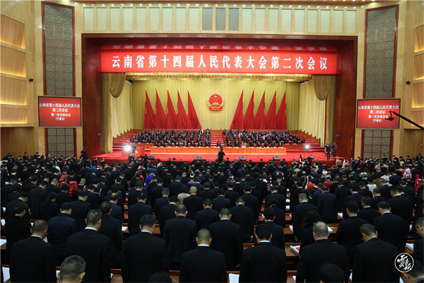 1月24日上午,云南省第十四届人民代表大会第二次会议开幕。开幕会上,与会人员集体默哀,向在昭通市镇雄县滑坡灾害中遇难的同胞表示深切哀悼。