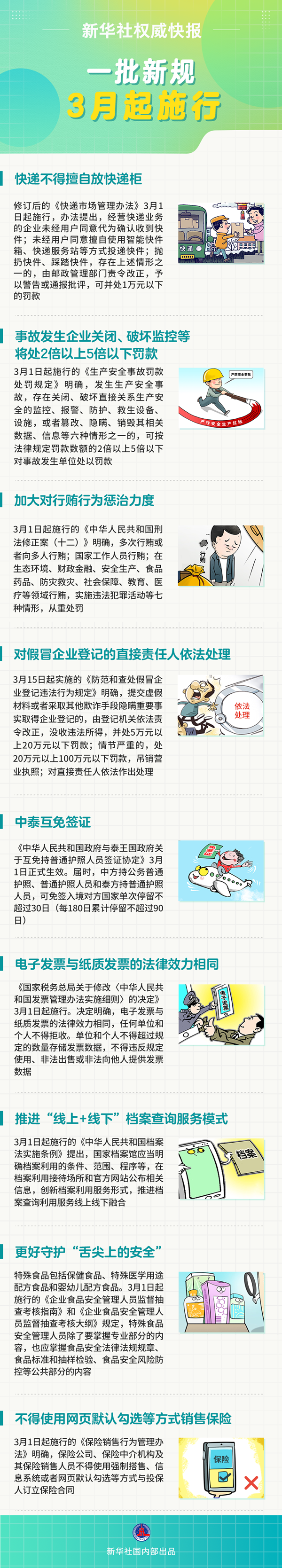 未经用户同意擅自确认收货、使用快递柜或驿站,快递企业或将面临罚款。关闭、破坏监控等,篡改、隐瞒、销毁相关数据的事故发生单位将被处2倍以上5倍以下罚款。加大对行贿行为惩治力度……2024年3月,这些新规将开始施行。