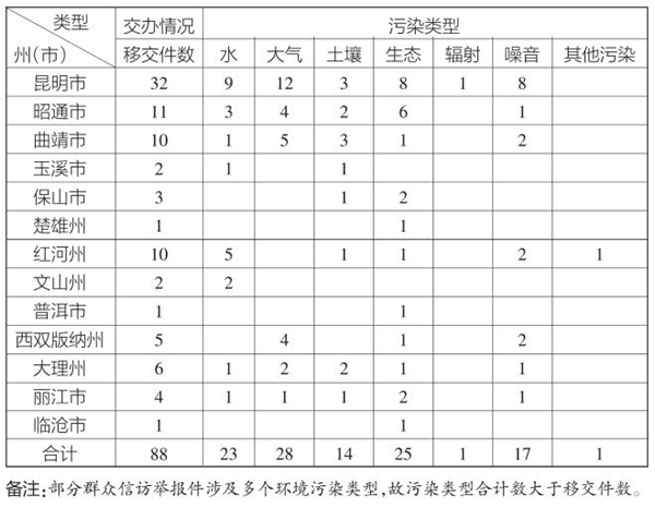 云南省中央生态环境保护督察群众来信来电举报污染类型统计表