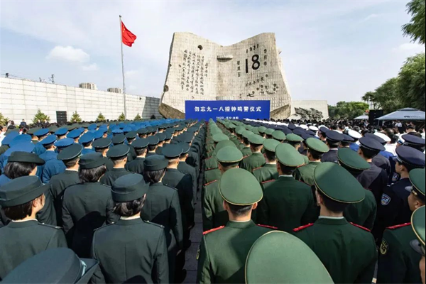 2023年9月18日拍摄的勿忘“九一八”撞钟鸣警仪式现场。新华社 发 陈松 摄