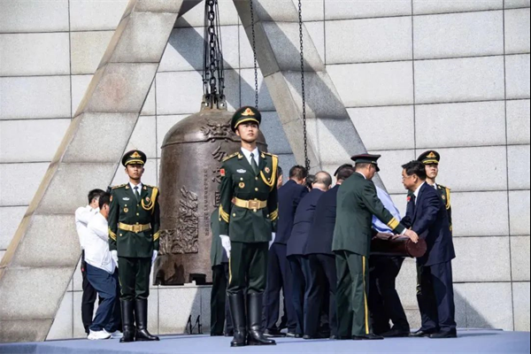 2023年9月18日,参加仪式的各界代表共同撞响“勿忘国耻”警世钟。新华社 发 陈松 摄