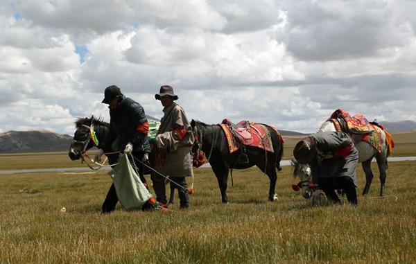 在三江源国家公园长江源(可可西里)园区治多管理处索加乡君曲村,百余生态管护员骑乘马匹日常巡护。图为巡护的生态管护员在索加乡君曲村附近捡拾垃圾。中新社记者 罗云鹏 摄