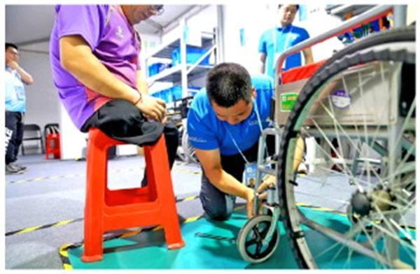图为全国第十二届残疾人运动会暨第九届特殊奥林匹克运动会乒乓球(大众组)比赛中,一位选手的轮椅出现故障,赛场维修站的工作人员进行快速维修。 CFP供图