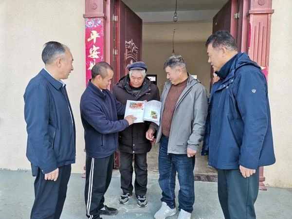 驻村工作队和沈家沟村委会把刊有樱桃种户陈光啟先进事迹的刊物送到该村民手中。唐金龙 摄