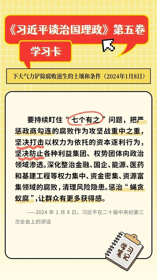 下大气力铲除腐败滋生的土壤和条件,是《习近平谈治国理政》第五卷深入论述的开展反腐败斗争的根本之道。持续保持惩治腐败高压态势,盯住“七个有之”问题、高悬惩治利剑,更是我们持续发力、纵深推进反腐败斗争的关键战略部署。那么“七个有之”具体指的是什么问题呢?一起来了解。