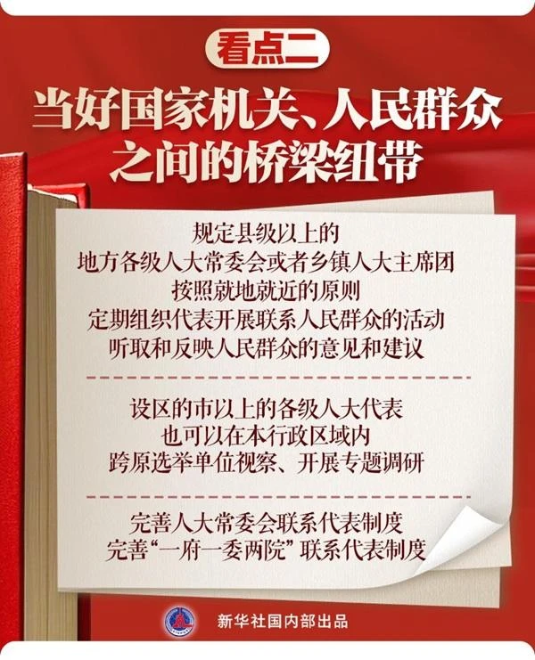 人大代表是党和国家联系人民群众的桥梁。代表法修正草案进一步拓展和深化“两个联系”制度机制,即密切国家机关同人大代表的联系,密切人大代表同人民群众的联系。