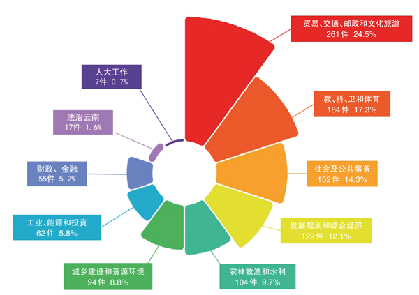 按照10个方面对1065件代表建议进行分类汇总,涉及“贸易、交通、物流和文化旅游”“教、科、卫和体育”“社会及公共事务”“发展规划和综合经济”的代表建议数量排在前四位,共726件,占建议总数的68.2%。
