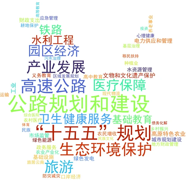 从代表建议“词频云图”可以看出:公路规划和建设、“十五五”规划、高速公路、生态环境保护、产业发展、旅游、园区经济、卫生健康服务、医疗保障、铁路等小类的代表建议数量较多。