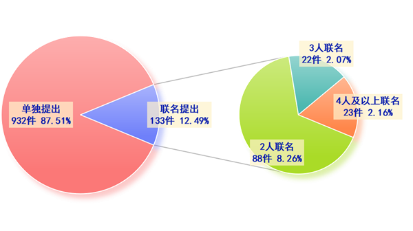 代表单独提出建议932件,占建议总数的87.51%。代表联名提出建议133件,占建议总数12.49%。其中2人联名提出88件、3人联名提出22件、4人联名提出13件、5人联名提出2件、5人以上联名提出8件。