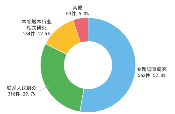 本次会议代表通过“专题调查研究”形成的建议有562件,通过“联系人民群众”形成的316件,通过“本领域本行业相关研究”形成的134件,合计1012件、占建议总数的95.0%。