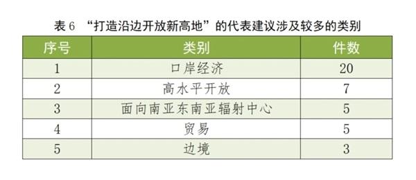 该方面建议共56件,占总数的5.26%。其中“口岸经济”“高水平开放”“面向南亚东南亚辐射中心”“贸易”“边境”等类别的建议较多。