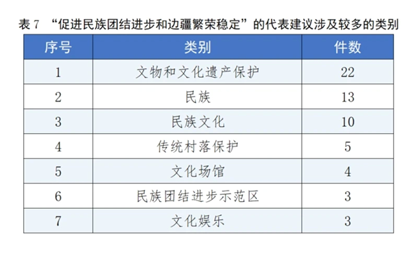 该方面建议共60件,占总数的5.63%。其中“文物和文化遗产保护”“民族”“民族文化”“传统村落保护”“文化场馆”“民族团结进步示范区”等类别的建议较多。