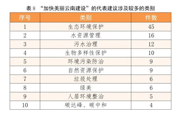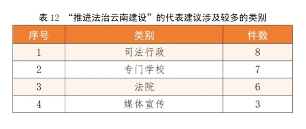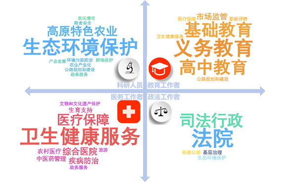 从有关行业领域代表提出建议的情况看,教育领域的代表较为关注“义务教育”“基础教育”“高中教育”和“普惠托育”等类别,科研领域的代表较为关注“生态环境保护”“高原特色农业”和“环境污染防治”等类别,医疗卫生领域的代表较为关注“卫生健康服务”“医疗保障”和“综合医院”等类别,政法工作领域的代表较为关注“法院”“司法行政”和“基层治理”等类别。