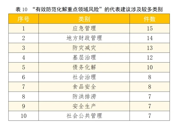 该方面建议共118件,占总数的11.08%。其中“应急管理”“地方财政管理”“防灾减灾”“基层治理”“债务化解”等类别建议较多。