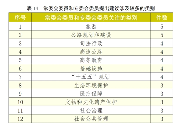 从常委会委员和专委会委员提出建议的情况看,他们较为关注“旅游”“公路规划和建设”“司法行政”“高速公路”“高等教育”“基础设施”“‘十五五’规划”“生态环境保护”“医疗保障”“文物和文化遗产保护”“社会治理”和“社会公共管理”等类别。
