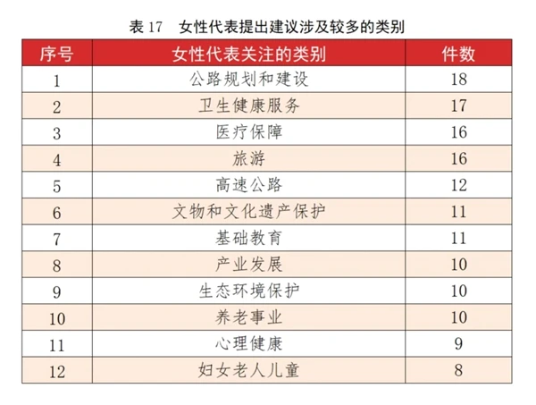 女性代表提出建议涉及较多的类别