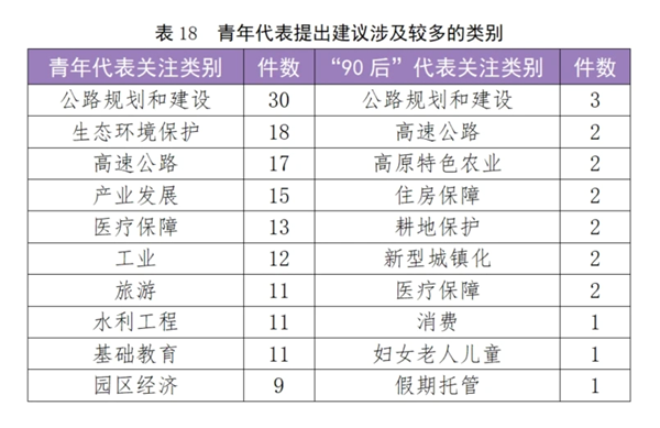 青年代表提出建议涉及较多的类别