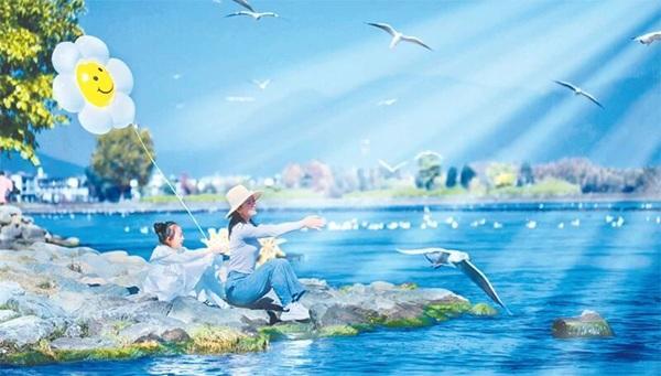 近年来,云南省加强洱海全流域生态保护治理,建成129公里生态廊道,提供了“水清、岸绿、景美”的亲水空间。图为2024年11月8日,游客在洱海边与海鸥亲密互动。大理州洱海管理局 供图