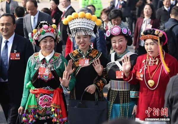 2025年3月8日,十四届全国人大三次会议在北京人民大会堂举行第二次全体会议,会后全国人大代表金瑞瑞(左二)走出会场。中新社记者 杨可佳 摄