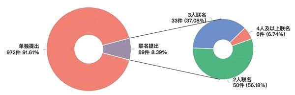 代表单独提出建议972件,占建议总数的91.6%;代表联名提出建议89件,占建议总数8.4%。