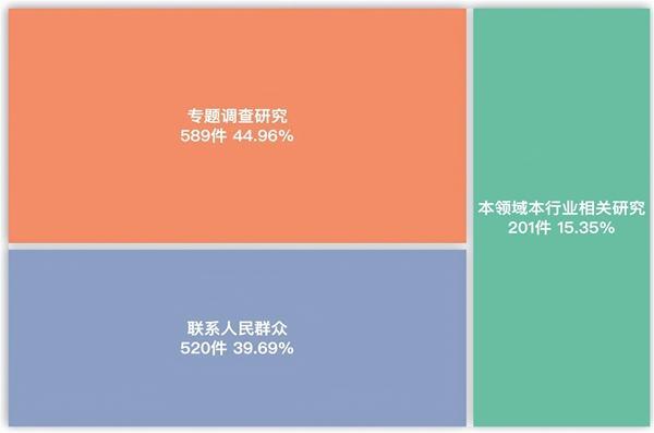 本次会议代表通过“专题调查研究”形成的建议有589件,“联系人民群众”520件、“本领域本行业相关研究”201件。代表提出需要承办单位在办理过程中加强面商的建议共有565件,占建议总数的53.3%。