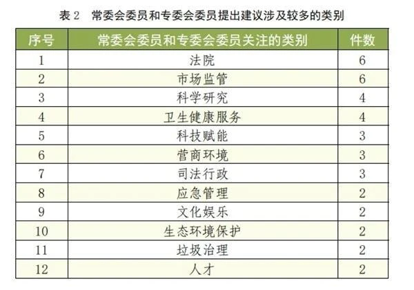 从常委会委员和专委会委员提出建议的情况看,主要聚焦“法院”“市场监管”“科学研究”“卫生健康服务”“科技赋能”“营商环境”“司法行政”“应急管理”“文化娱乐”“生态环境保护”“垃圾治理”和“人才”等类别。