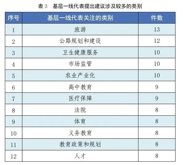 从基层一线代表提出建议的情况看,他们共同关注“旅游”“公路规划和建设”等类别。此外,农民代表的建议还关注“水利工程”“高原特色农业”等类别,一线工人代表的建议还关注“工业”“铁路”“电力供应和管理”等类别,专业技术人员代表的建议还关注“市场监管”“卫生健康服务”“高中教育”等类别,非公有制经济人士代表的建议还关注“就业创业”“民营经济”等类别。