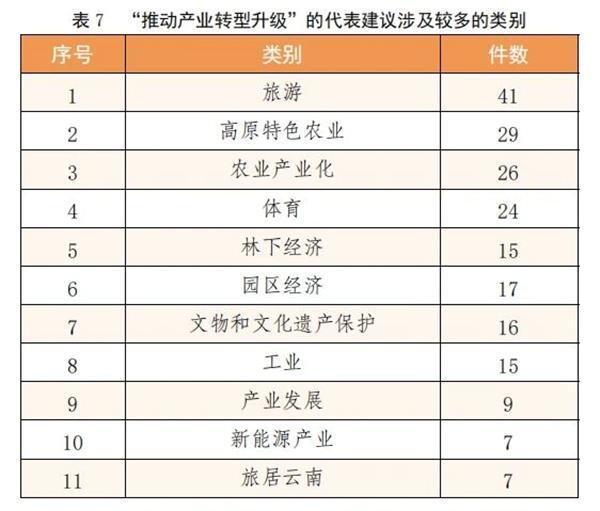 该方面建议共224件,占总数的21.1%。其中“旅游”“高原特色农业”“农业产业化”“体育”“林下经济”“园区经济”“文物和文化遗产保护”“工业”等类别的建议较多。