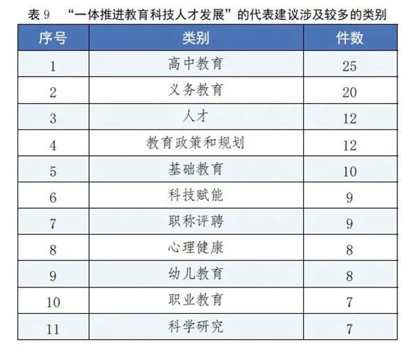 该方面建议共155件,占总数的14.6%。其中“高中教育”“义务教育”“人才”“教育政策和规划”“基础教育”“科技赋能”“职称评聘”等类别的建议较多。