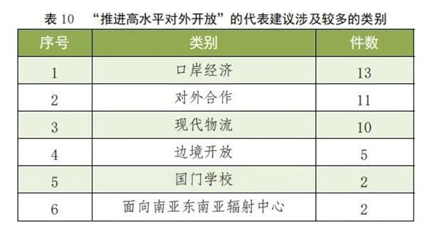 该方面建议共45件,占总数的4.2%。其中“口岸经济”“对外合作”“现代物流”“边境开放”等类别的建议较多。