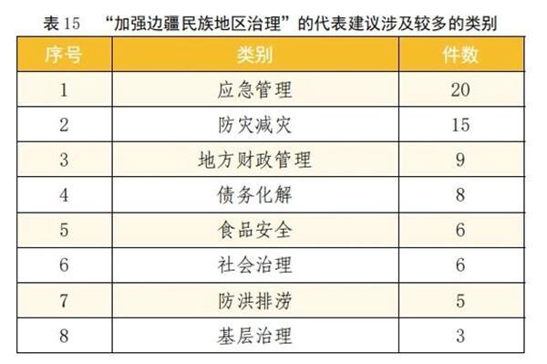 该方面建议共78件,占总数的7.4%。其中“应急管理”“防灾减灾”“地方财政管理”“债务化解”“食品安全”“社会治理”“防洪排涝”等类别建议较多。