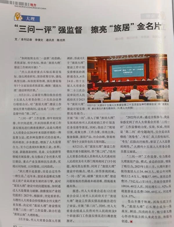 近日,《中国人大》2025年第24期刊发文章《大理:“三问一评”强监督 擦亮“旅居”金名片》关注大理州人大常委会开展“三问一评”工作监督,助推“旅居大理”建设。