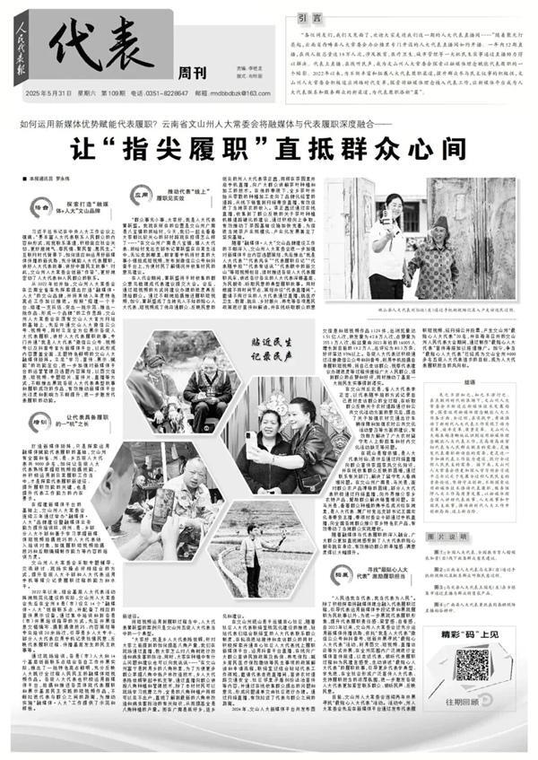 近日,《人民代表报》推出2025年度人大代表工作典型案例,其中,文山州人大常委会运用新媒体优势赋能代表履职,不断丰富和拓展人大代表履职渠道、讲好基层民主故事的创新实践受到关注。