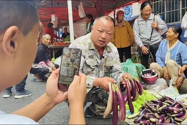 马关县人大代表王国龙(左)在乡镇集市通过直播为群众销售农产品。