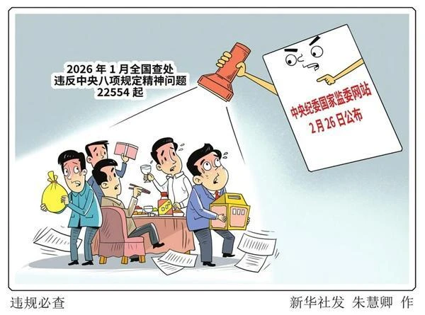中央纪委国家监委网站26日公布全国查处违反中央八项规定精神问题情况月报数据。通报显示,今年1月,全国共查处违反中央八项规定精神问题22554起,批评教育和处理28544人(包括9名省部级干部、148名地厅级干部),给予党纪政务处分20446人。