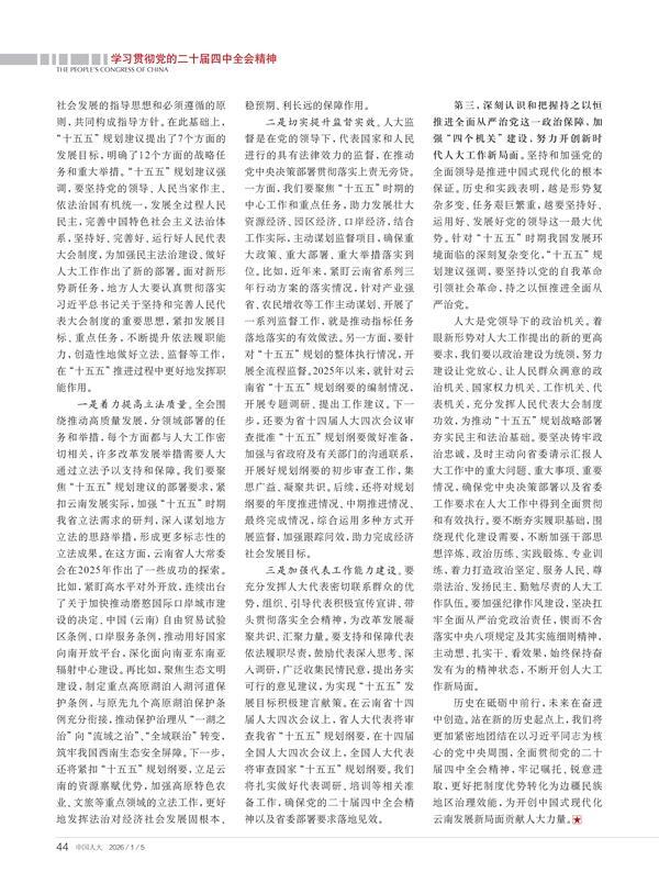 第二,深刻认识和把握“十五五”发展的指导方针和实践要求,围绕大局谋划和推进人大工作,为云南高质量发展提供法治保障。“十五五”规划建议明确提出了“十五五”时期经济社会发展的指导思想和必须遵循的原则,共同构成指导方针。在此基础上,“十五五”规划建议提出了7个方面的发展目标,明确了12个方面的战略任务和重大举措。“十五五”规划建议强调,要坚持党的领导、人民当家作主、依法治国有机统一,发展全过程人民民主,完善中国特色社会主义法治体系,坚持好、完善好、运行好人民代表大会制度,为加强民主法治建设、做好人大工作作出了新的部署。面对新形势新任务,地方人大要认真贯彻落实习近平总书记关于坚持和完善人民代表大会制度的重要思想,紧扣发展目标、重点任务,不断提升依法履职能力,创造性地做好立法、监督等工作,在“十五五”推进过程中更好地发挥职能作用。