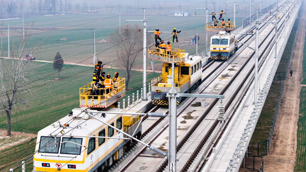 在雄商高铁山东菏泽段,中国铁路济南局集团有限公司济南供电段的工作人员对接触网设备进行检查验收(2026年2月1日摄,无人机照片)。新华社记者 郭绪雷 摄