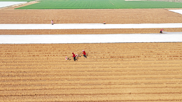 农民在山东省临沂市郯城县郯城街道的一处蔬菜种植基地劳作(2026年3月20日摄,无人机照片)。新华社发(张春雷 摄)